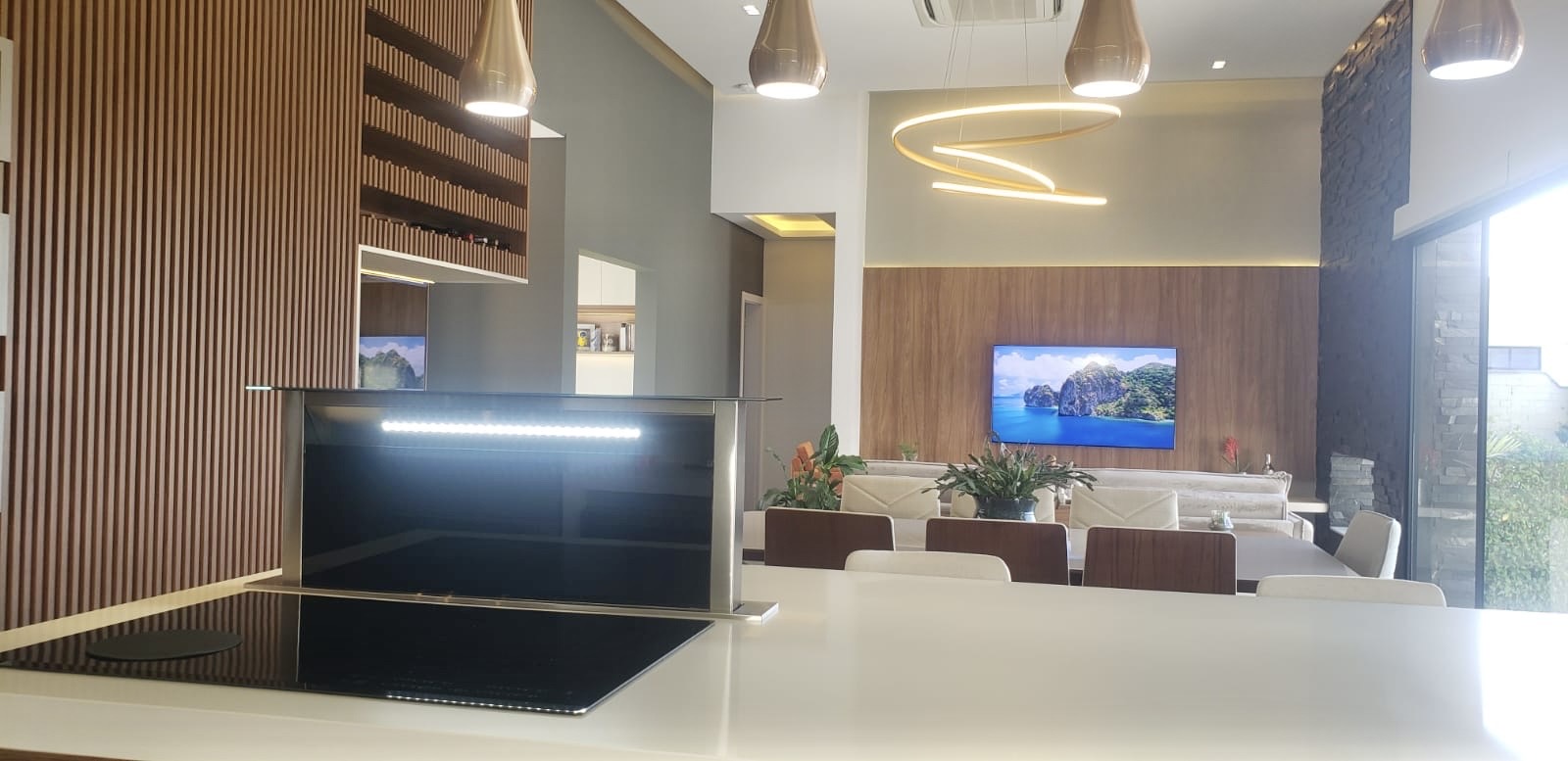 - Cozinha completa com armários, ilha com até 5 lugares, fogão de indução e coifa 🍳