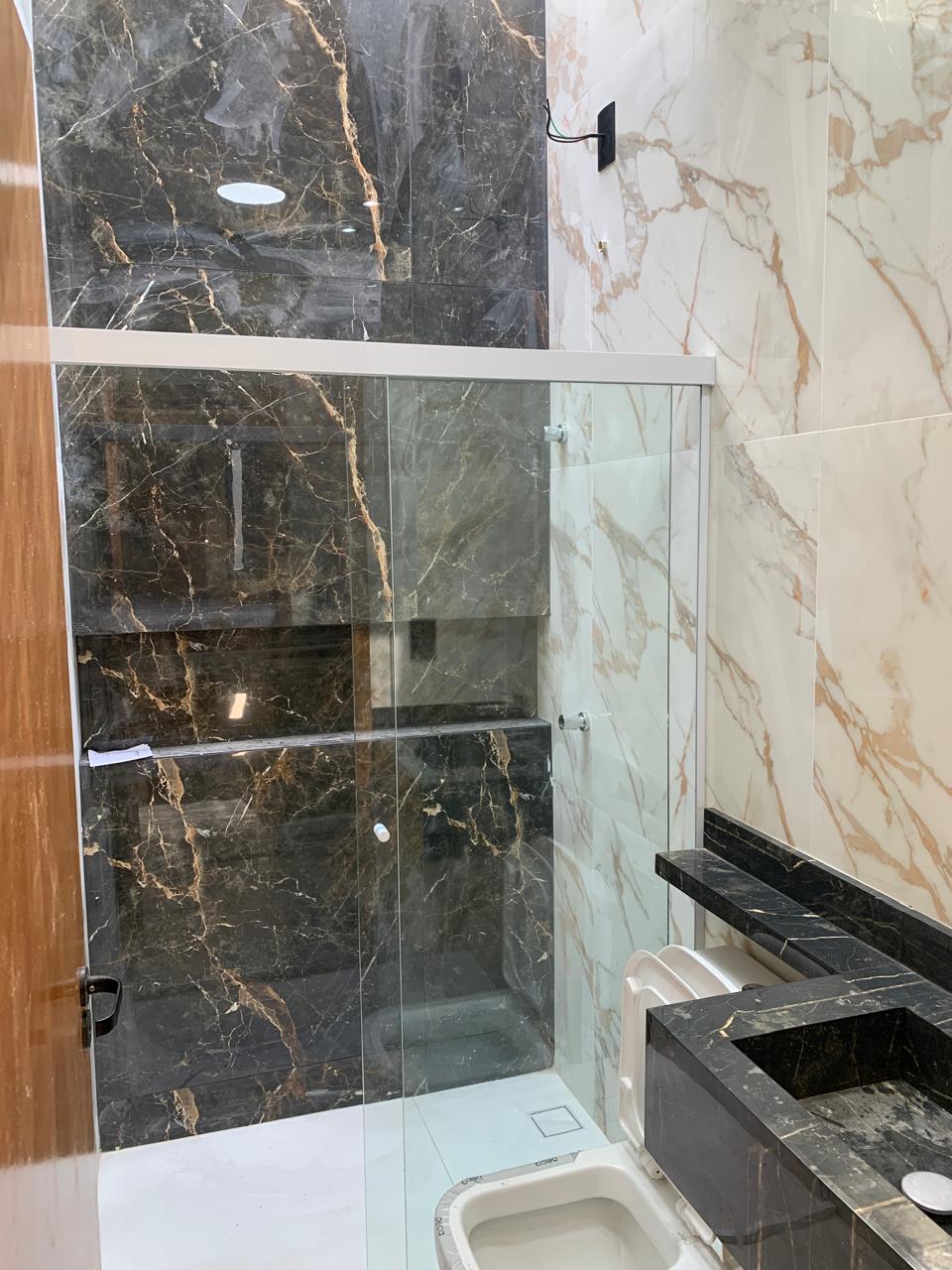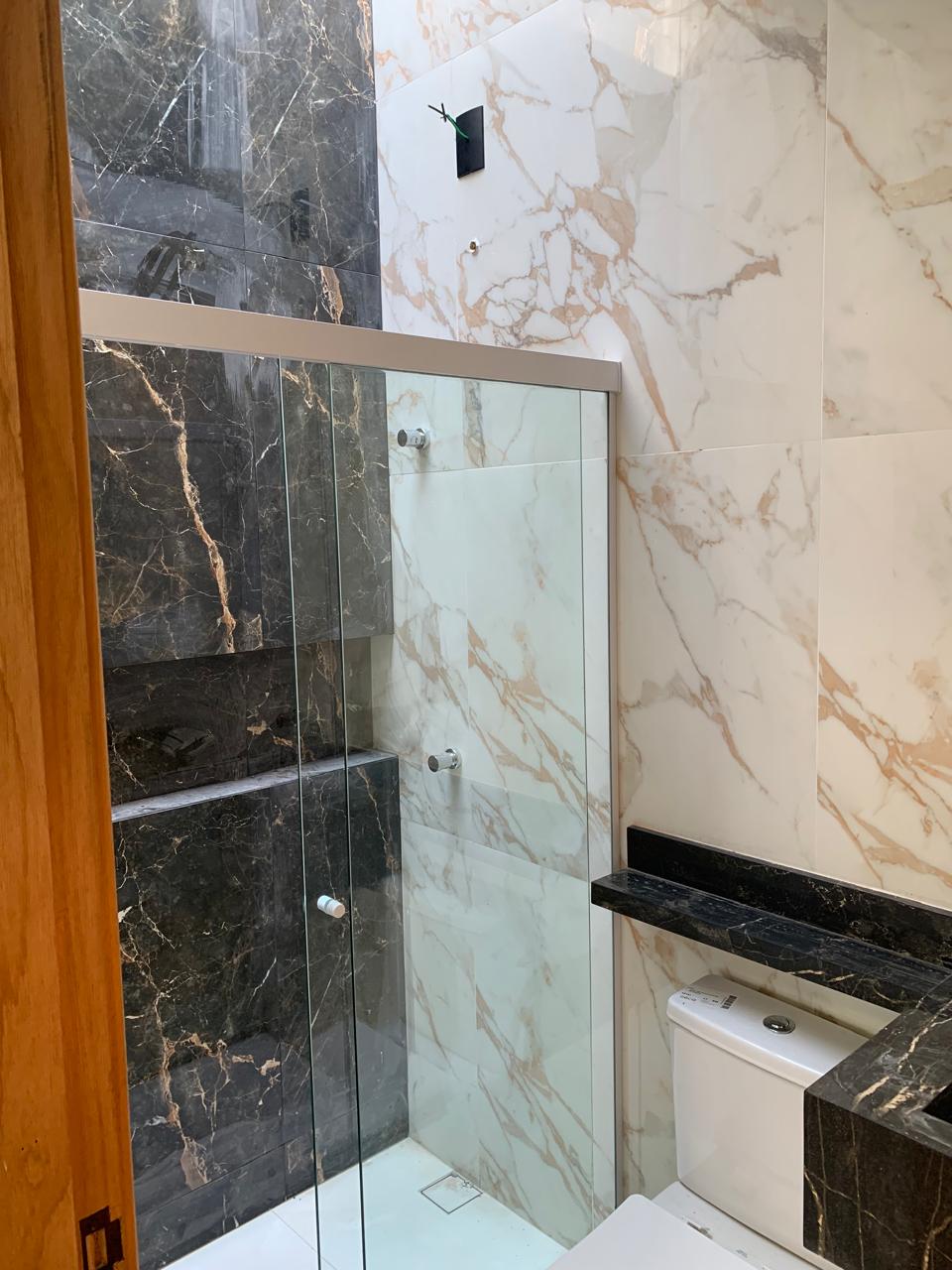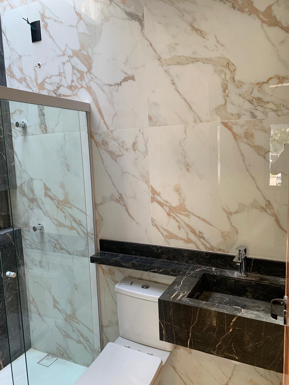 O imóvel conta ainda com 1 banheiro social, 1 lavabo, 2 vagas de garagem, sendo 1 descoberta, e acabamento moderno com rebaixo de gesso nos quartos e lavatórios em porcelanato.