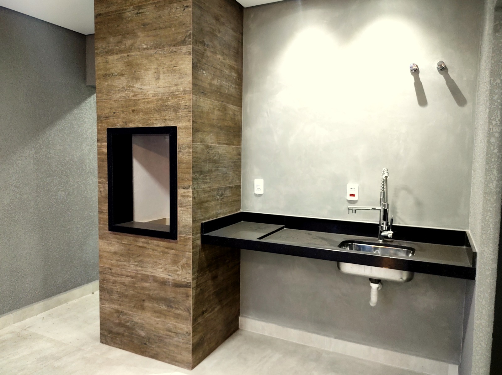 Cozinha planejada integrada à área gourmet, já com móveis instalados