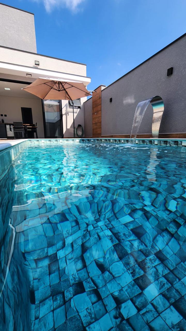 Piscina aquecida com prainha, cascata inox, iluminação em LED e cerca de proteção removível