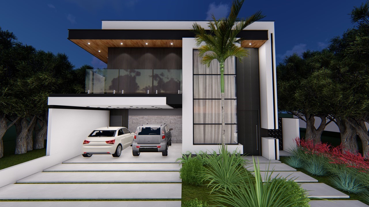 Fachada moderna com projeto de iluminação sofisticado e paisagismo completo que valoriza ainda mais a beleza do imóvel