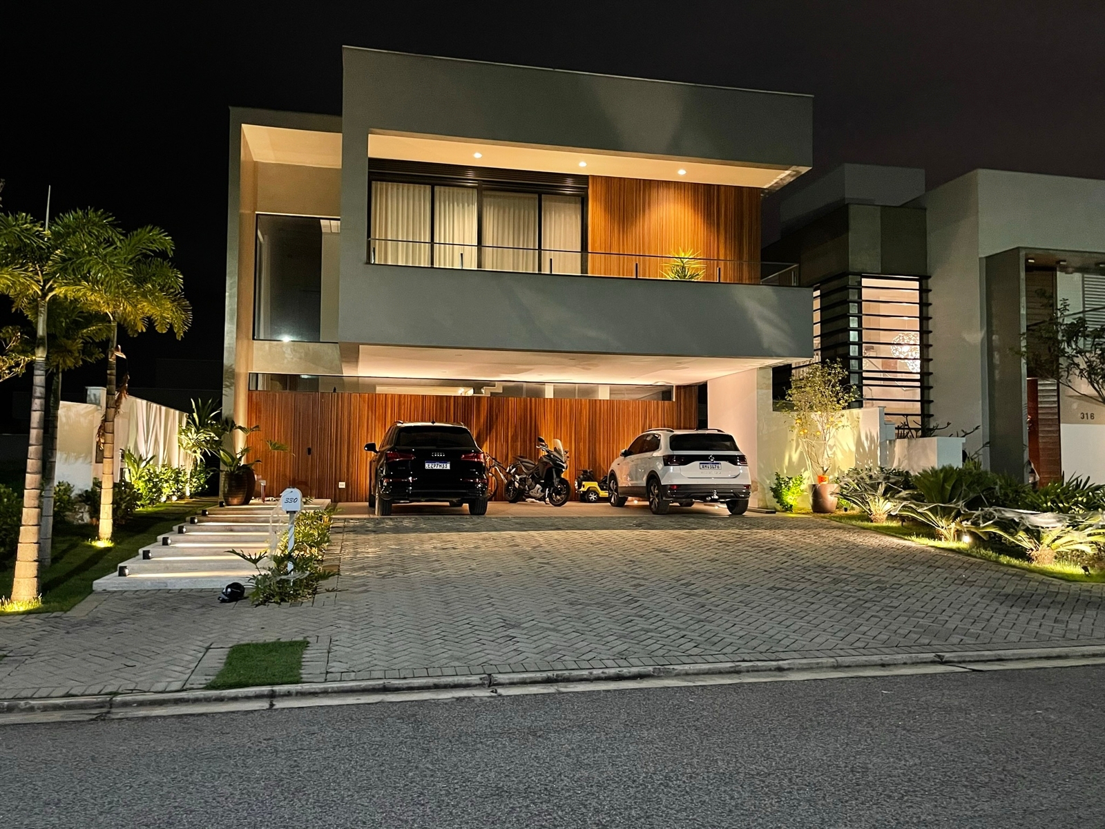 Painel ripado cumaru na fachada e garagem