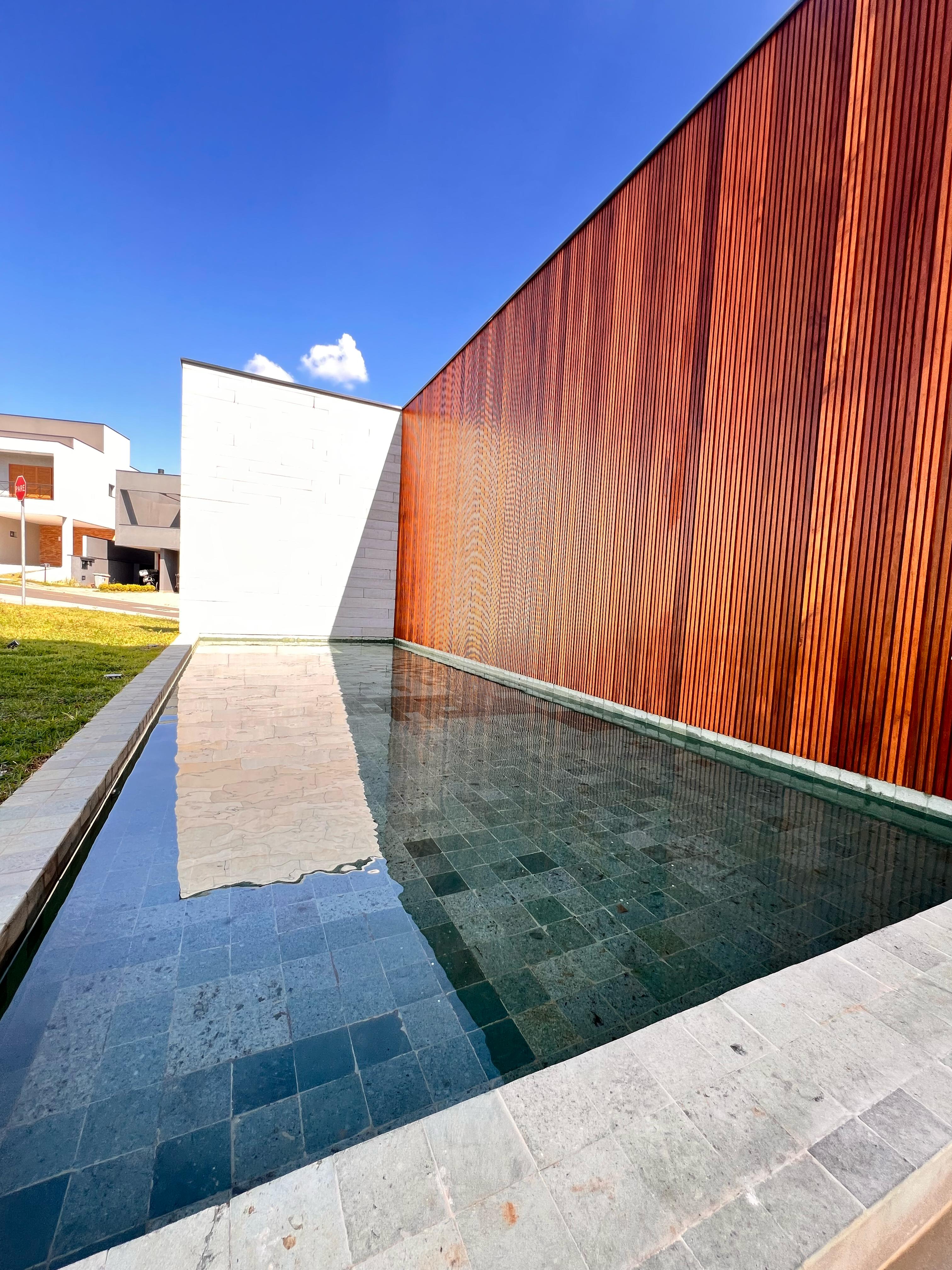 Espelho d’água frontal com pedra Hijau e iluminação embutida