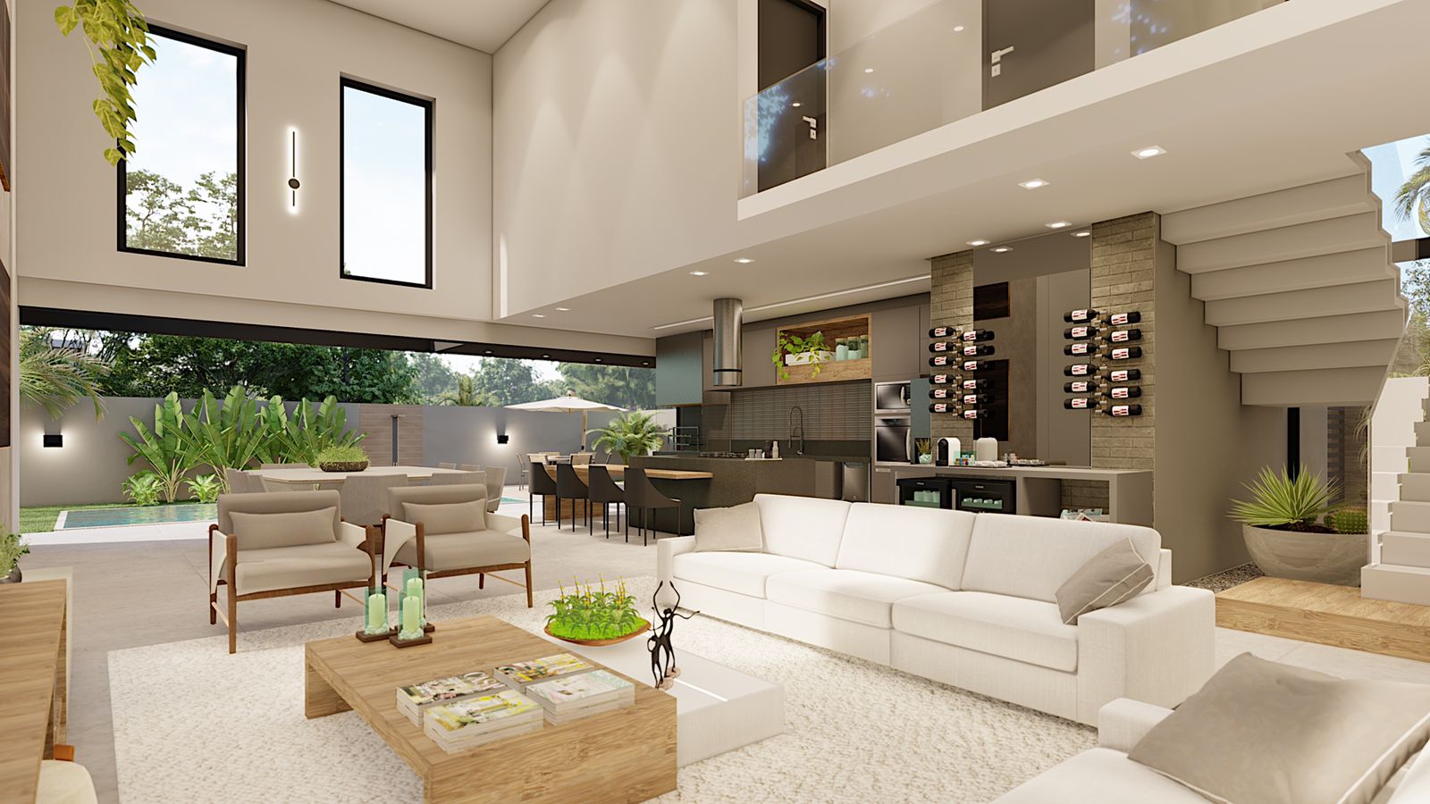 Ambientes integrados, com sala de estar, sala de TV, sala de jantar e cozinha em conceito aberto, promovendo liberdade, conforto e luminosidade natural.