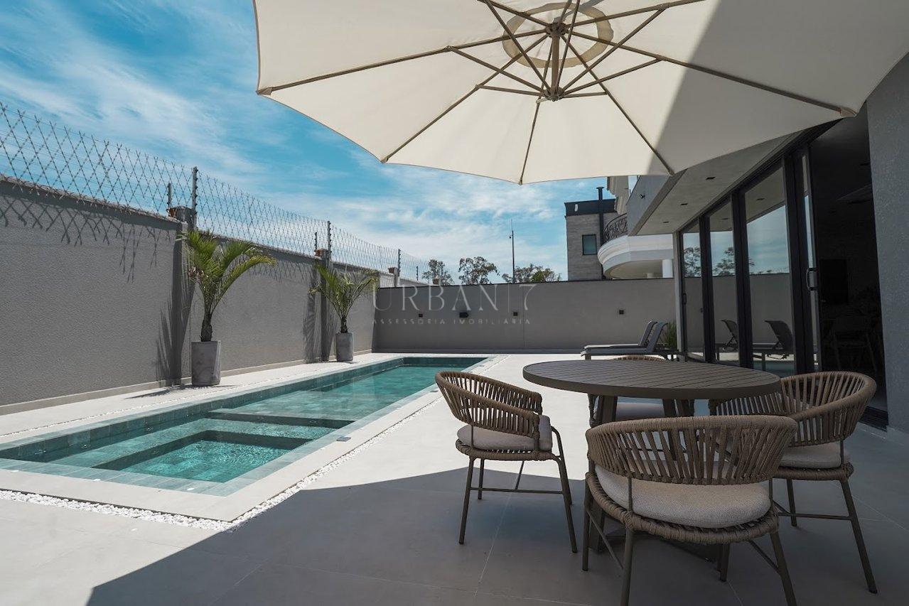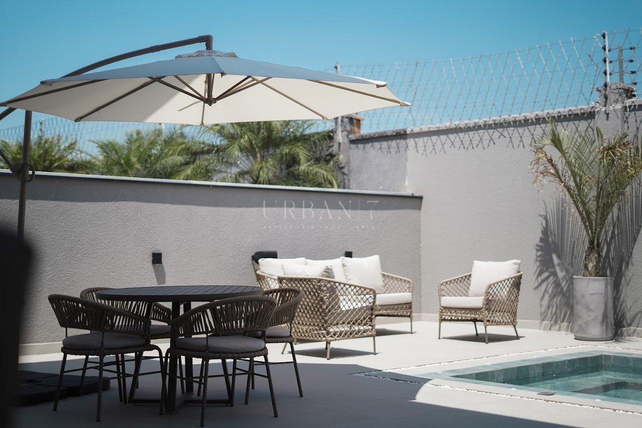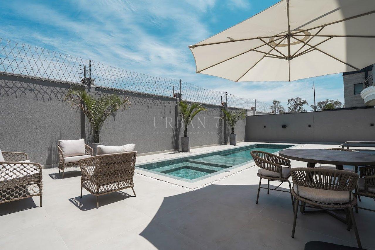 Na área externa, o destaque é a piscina com prainha, banheiro de apoio e despejo, criando um espaço perfeito para lazer e momentos de relaxamento com a família.