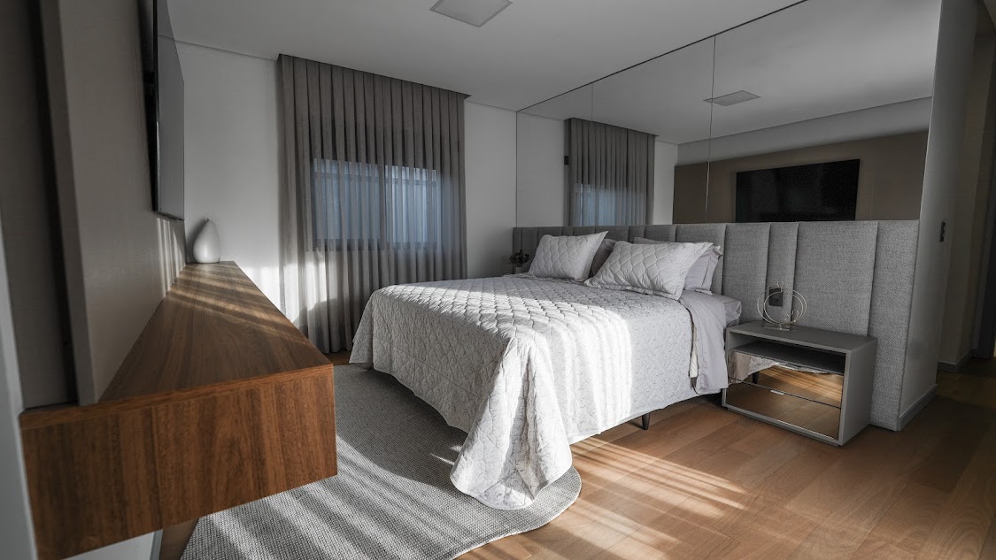 • 4 suítes com closet, sendo 1 suíte máster com piso em madeira maciça