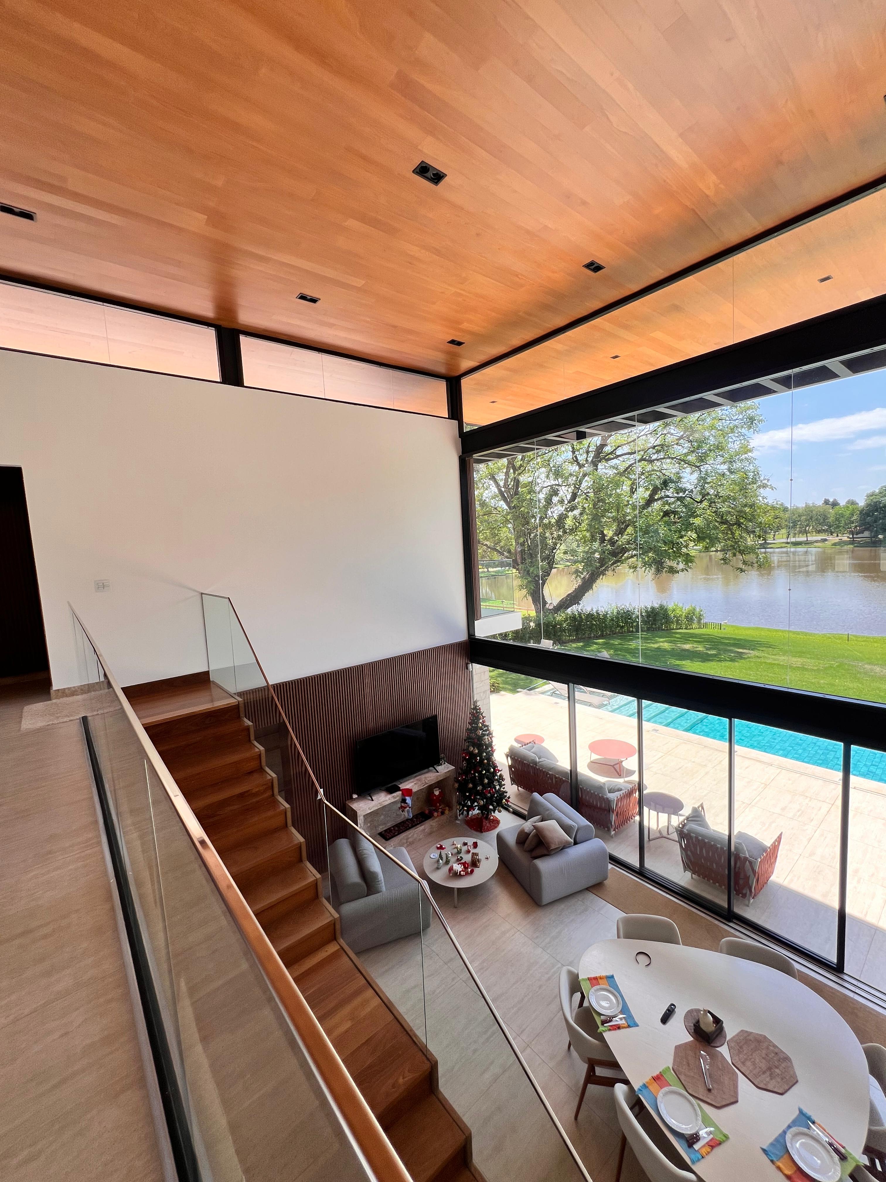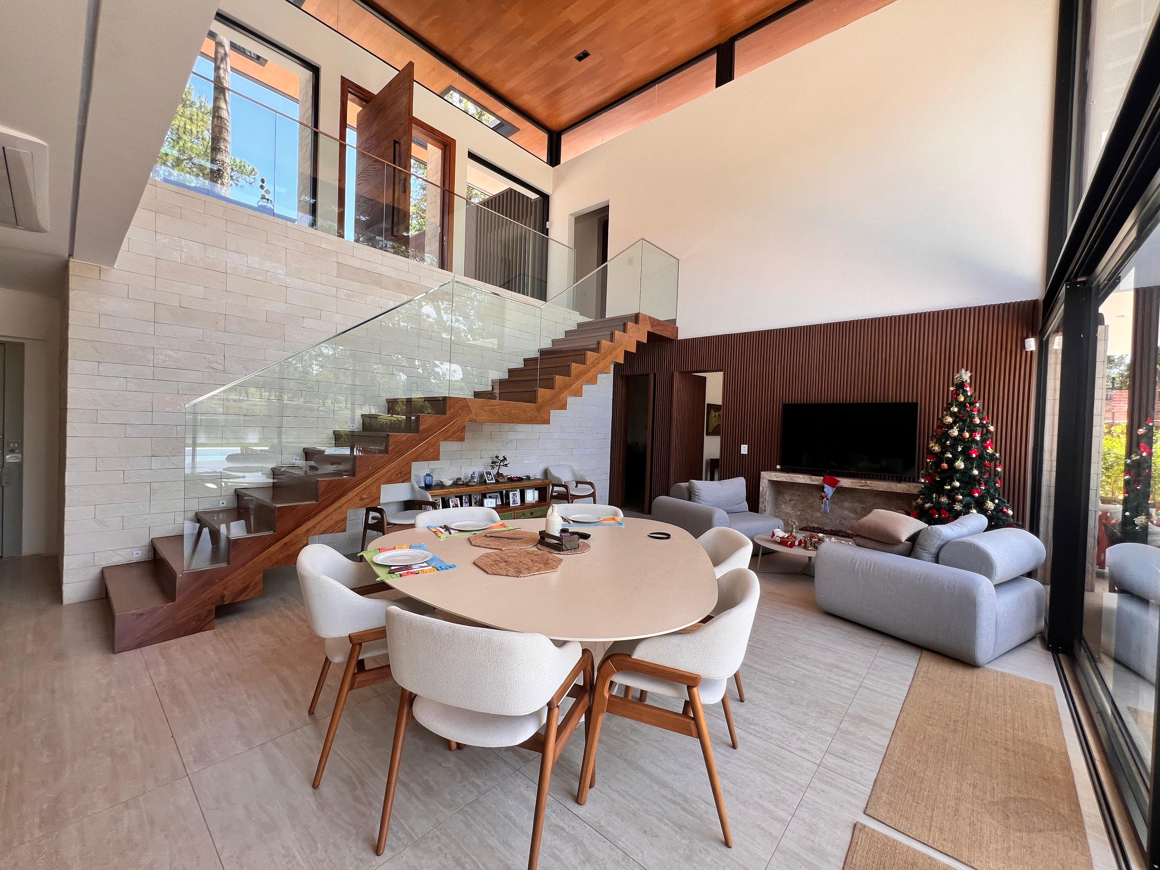 Acabamentos de alto padrão: forro em madeira, alumínio amadeirado, revestimentos cimentícios, porcelanato natural e travertino romano bruto