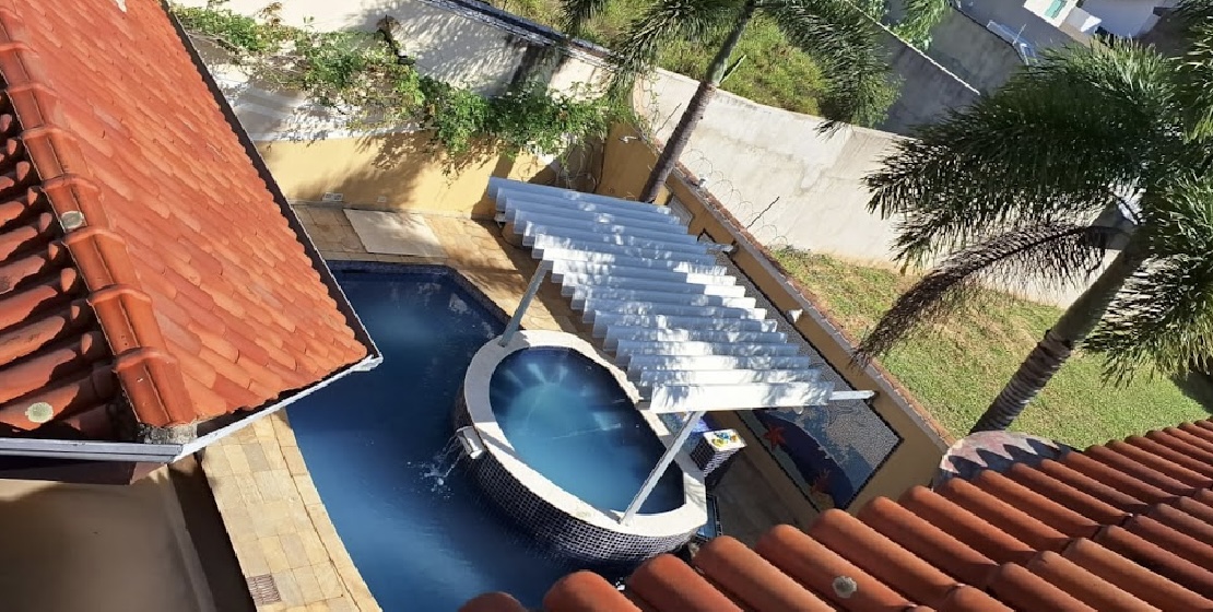 Piscina em concreto armado com azulejos e hidromassagem aquecida para até 14 pessoas