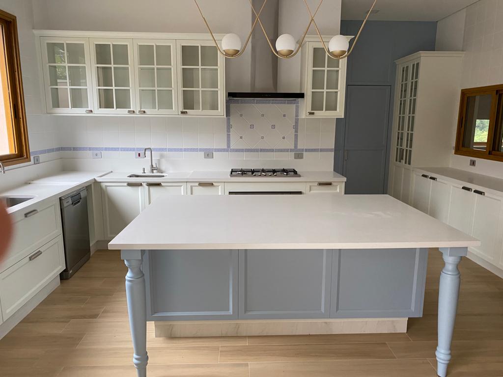 3 copas independentes, cada uma com armários, pia, forno de micro-ondas, frigobar e máquina de café expresso