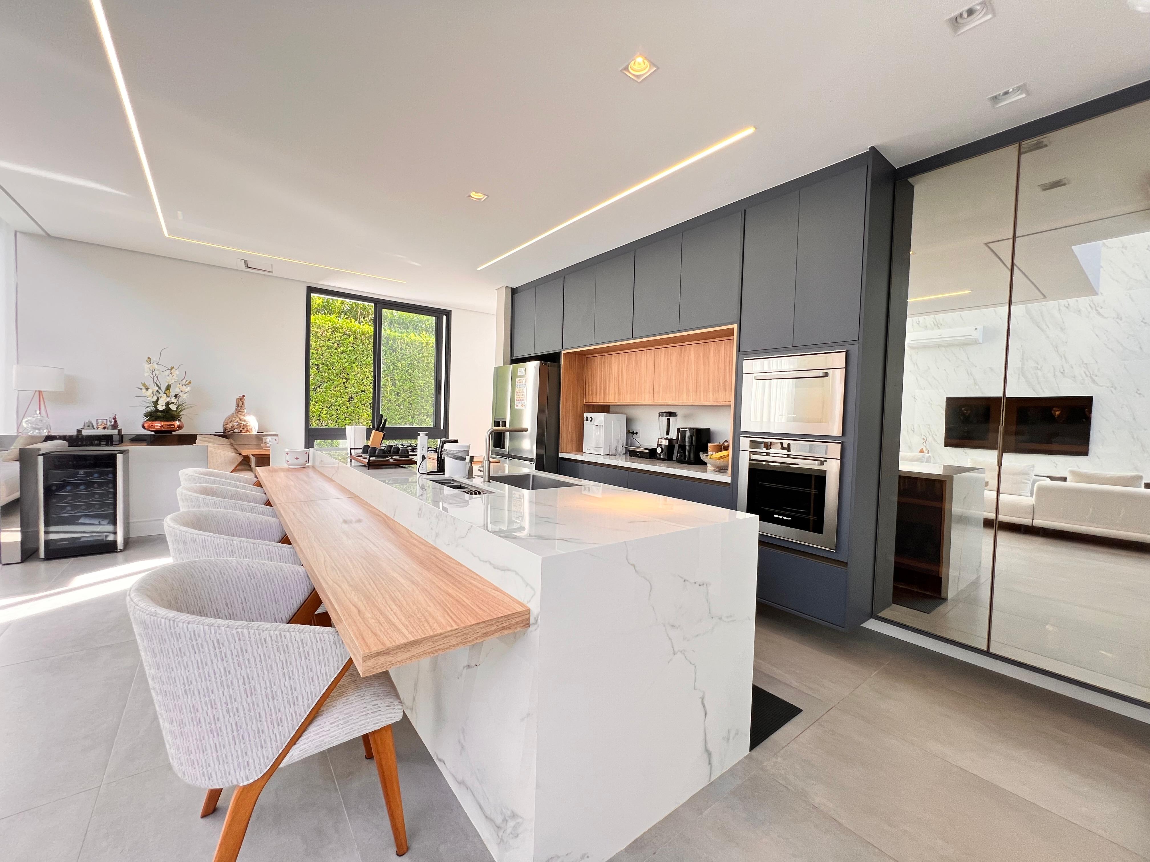 Cozinha integrada, com móveis planejados, forno elétrico, forno a gás e geladeira Side by Side;
