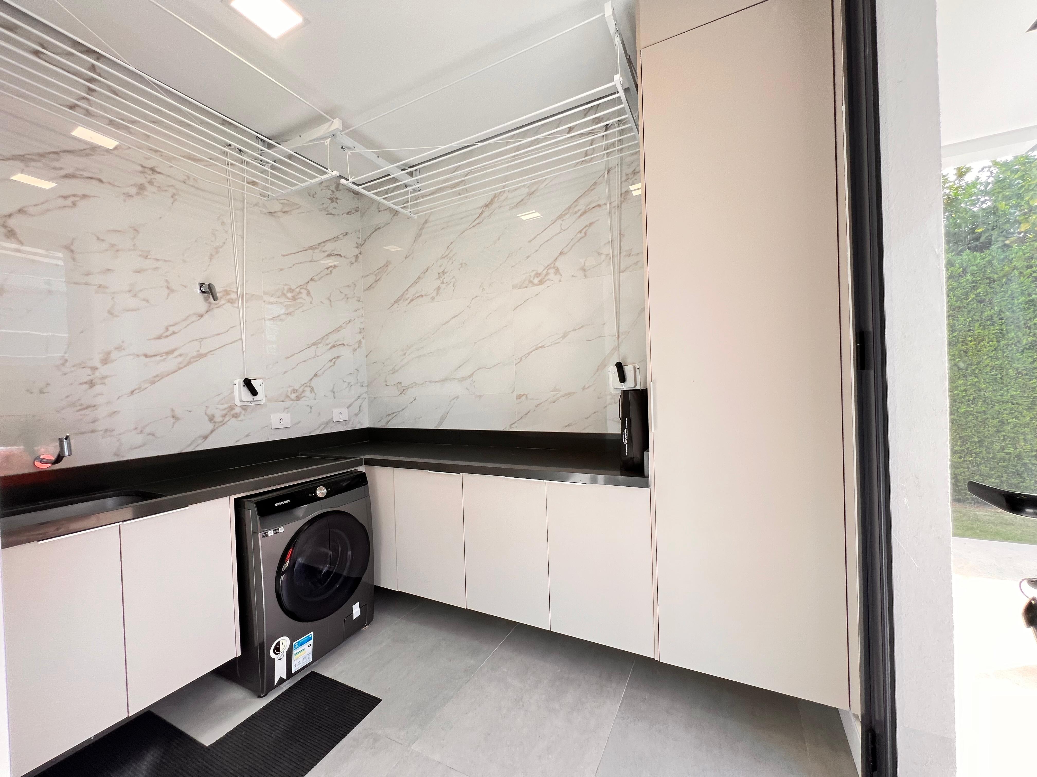 Lavabo, despensa e lavanderia com armários planejados, garantindo funcionalidade no dia a dia.